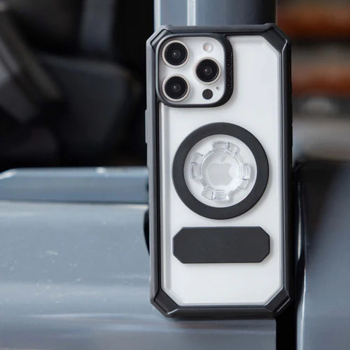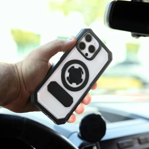 The iPhone 15 Pro clear case is compatible with all of ROKFORM's magnetic and RokLock® twist lock mounts, perfect for cars, trucks, bikes, motorcycles, golf carts, and more. You can instantly stick it to any magnetic surface or securely twist and lock it to any of our twist lock mounts, just like our Rugged case. Join thousands of satisfied customers who swear by the peace of mind and convenience our cases provide, year after year.