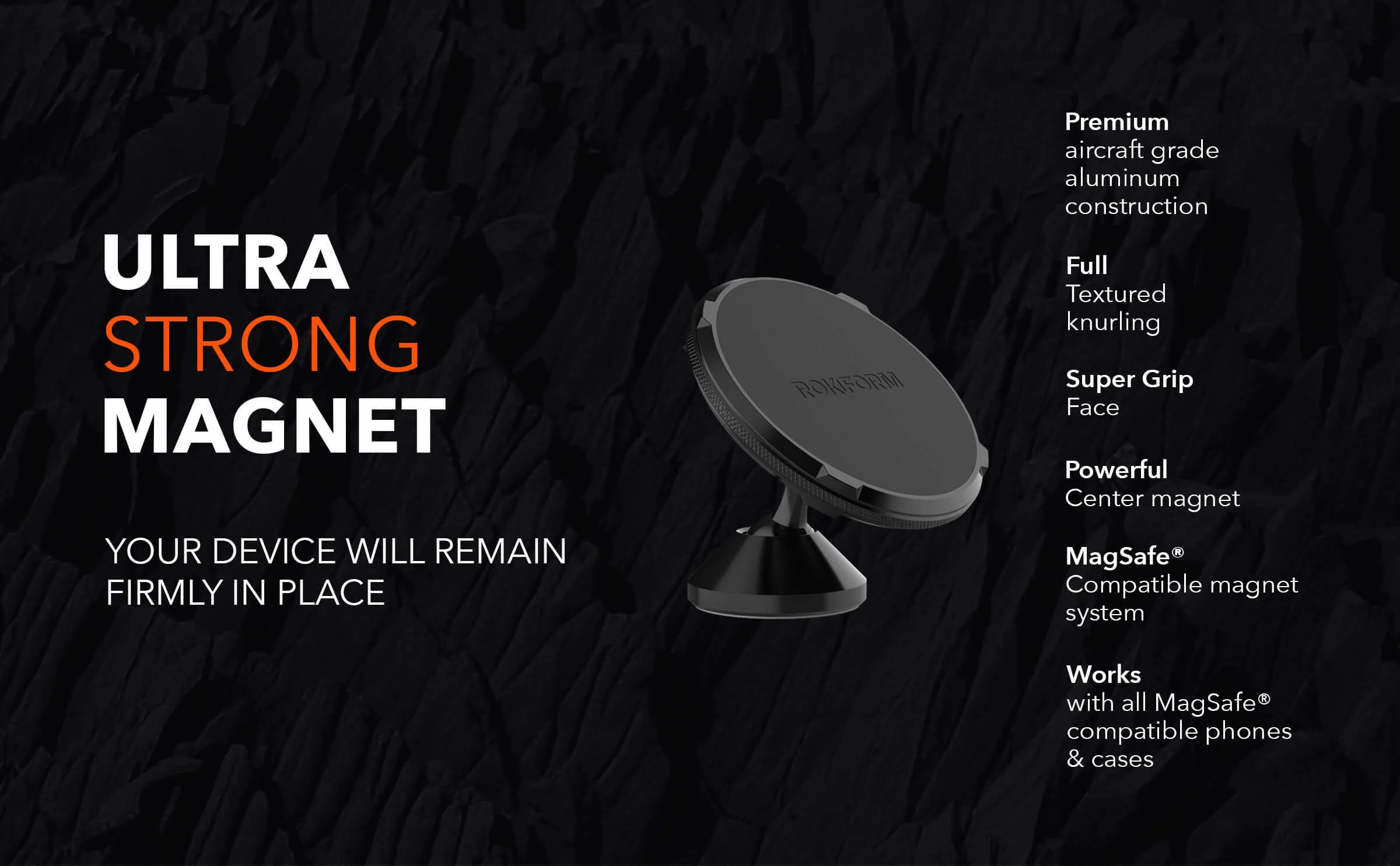 Adjust your phone to the perfect viewing angle with 360-degree rotation via the CNC machined aircraft aluminum swivel. The fully adjustable head features an array of MagSafe® compatible magnets along with a heavy-duty center magnet that works with all MagSafe® compatible phones & cases and all ROKFORM magnetic cases.